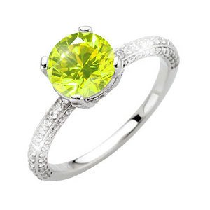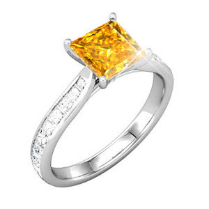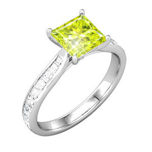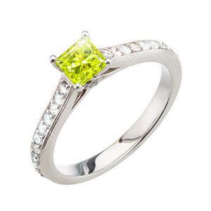 Stunning Princess Cut Engagement 18K White Gold Ring with Greenish-Yellow Diamond